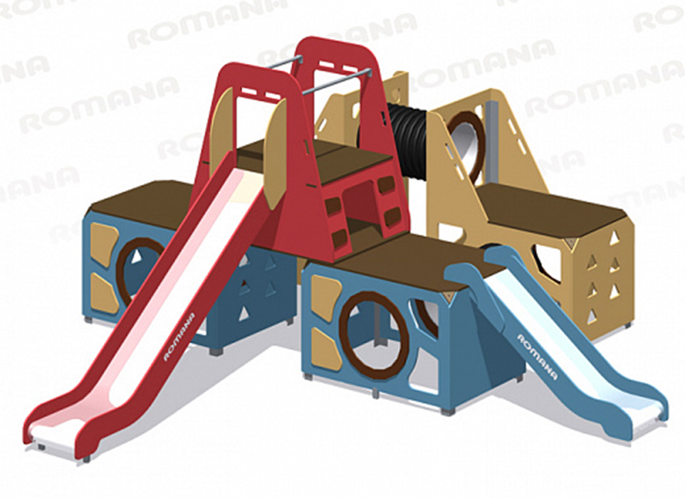 В сборе представляет собой конструкцию в виде двух прямоугольных площадок с треугольным лазом, собраных со стенками с помощью уголков, установлены на грунтозацепы. Две площадки присоединены друг к другу с помощью лаза-труба. С одного из торцов прямоугольной площадки с треугольным лазом присоединены площадки прямоугольные с помощью лаза труба. С одной стороны одной из площадок с треугольным лазом установлена горка 950 мм. На площадки прямоугольные установлен игровой модуль треугольный, к которому присоединена Горка 1550 мм.